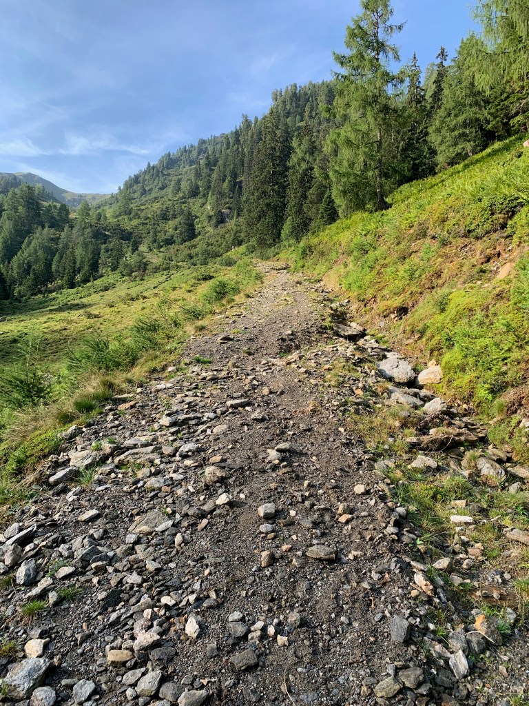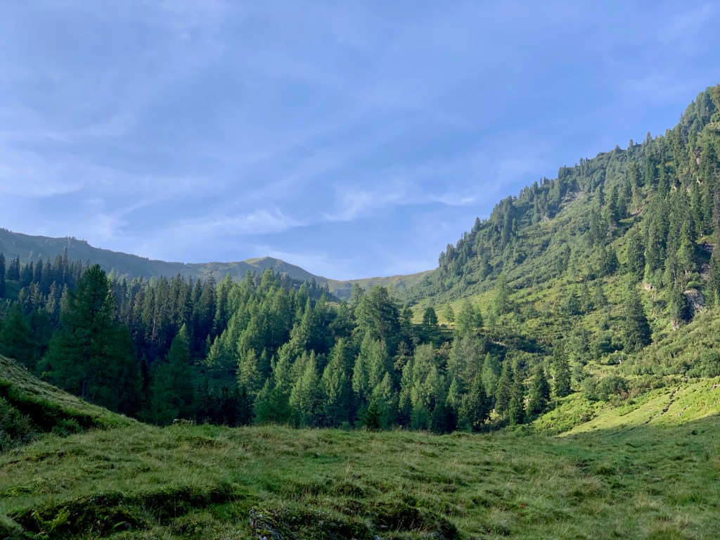 Nach dem Mörsbachwirtn, wo ich kurz auf Stempel (offizielles Ende Etappe 20) und Kaffee einkehre, wandere ich vorbei an der alten Mörsbachhütte und gleich weiter zur Vorderen Mörsbachalm – und abgesehen von einem weiteren nicht allzu langen Abkürzer wiederum auf Forststraßen Richtung Hinterer Mörsbachalm. Die erreiche ich aber nicht ganz – unmittelbar davor biegt der Weg rechts ab. Zuerst grauslich und steil empor, biegt der Weg dann für mich überraschend (doch nicht genau auf die Karte geschaut) nach rechts hinten ab. Vor hier aus geht es dann zwar recht romantisch und endlich nimmer auf Forststraßen aber dafür wirklich steil rauf zur Gstemmerscharte.