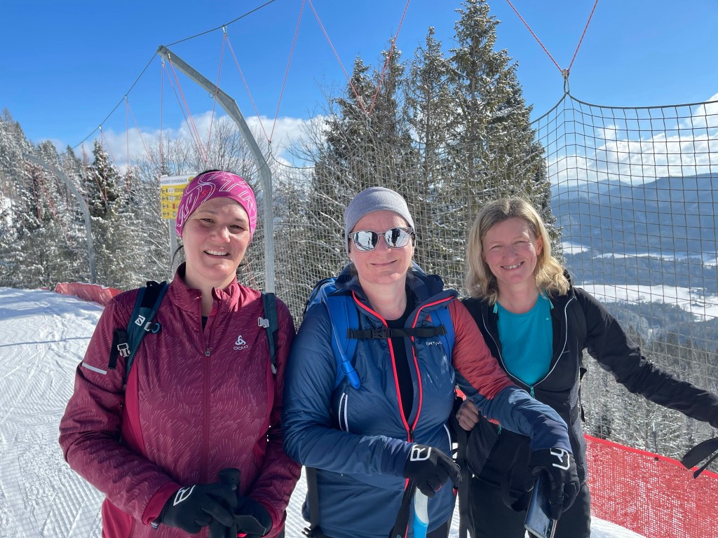 Es kündigt sich nicht nur ein sonniger Tag an, sondern auch eine kleine Neuschneeauflage lässt unsere Erwartungen steigen. So starten Conny und Roman, Birgit, Karin und ich kurz vor 9 die Tour.