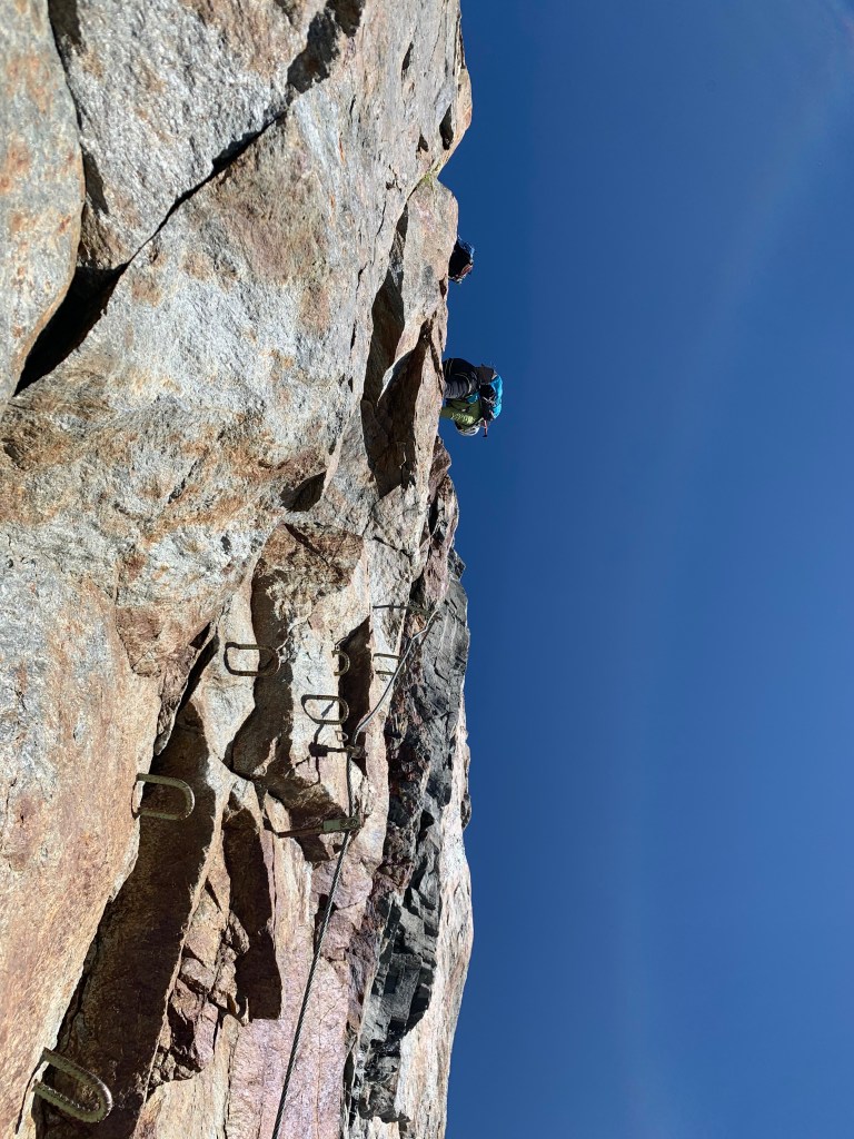 Etwas mühsam arbeiten wir uns durch Fels und loses Gestein hinauf zum Grat, wo wir dann endlich um 09:15 den Klettersteig erreichen. Von hier an geht es am Westgrat entlang meist recht angenehm und technisch einfach bis hinauf zum Gipfel. Durch den Nebel leider nicht sichtbar, ist der Grat bei schönem Wetter sicherlich an einigen Stellen recht luftig und erlaubt traumhafte Tiefblicke die Südwand hinunter. Gegen 10:30 erreichen wir dann den Gipfel. Einziger Vorteil des Wetters – es ist nix los und nur 2 andere Gruppen sind am Berg.