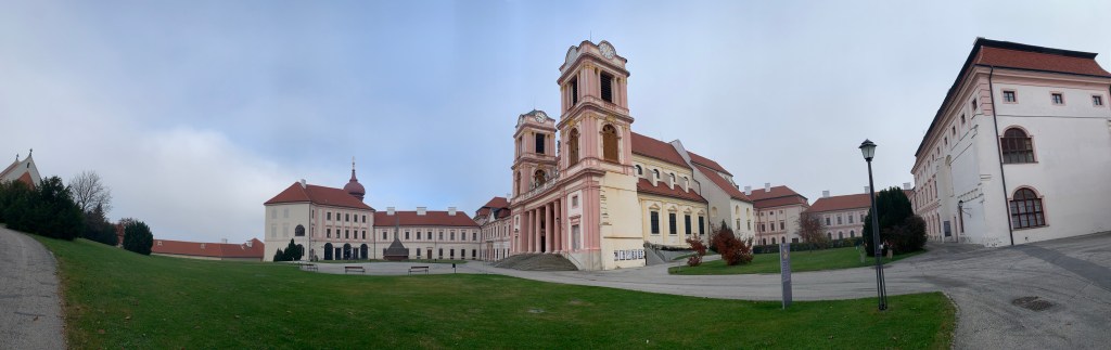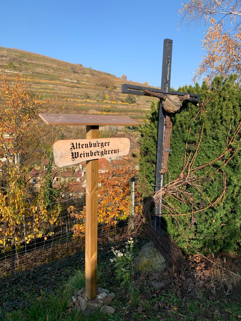 Durch herbstlich bunte Weingärten und Äcker wandern wir nun gemütlich ostwärts immer bergab Richtung Furth. Nach gut 5 km Wegzeit und rund einer Stunde Gehzeit steigen wir nun kurz und steil westseitig auf einem schönen Pfad den rund 200m hohen Stiftsberg hinauf und erreichen um 10 Uhr das verschlafene und menschenleere Stift Göttweig (alles geschlossen – Lockdown halt). Ein kurzes Gebet in der Stiftskirche und wir steigen wieder ab und erreichen nach 15min Furth.