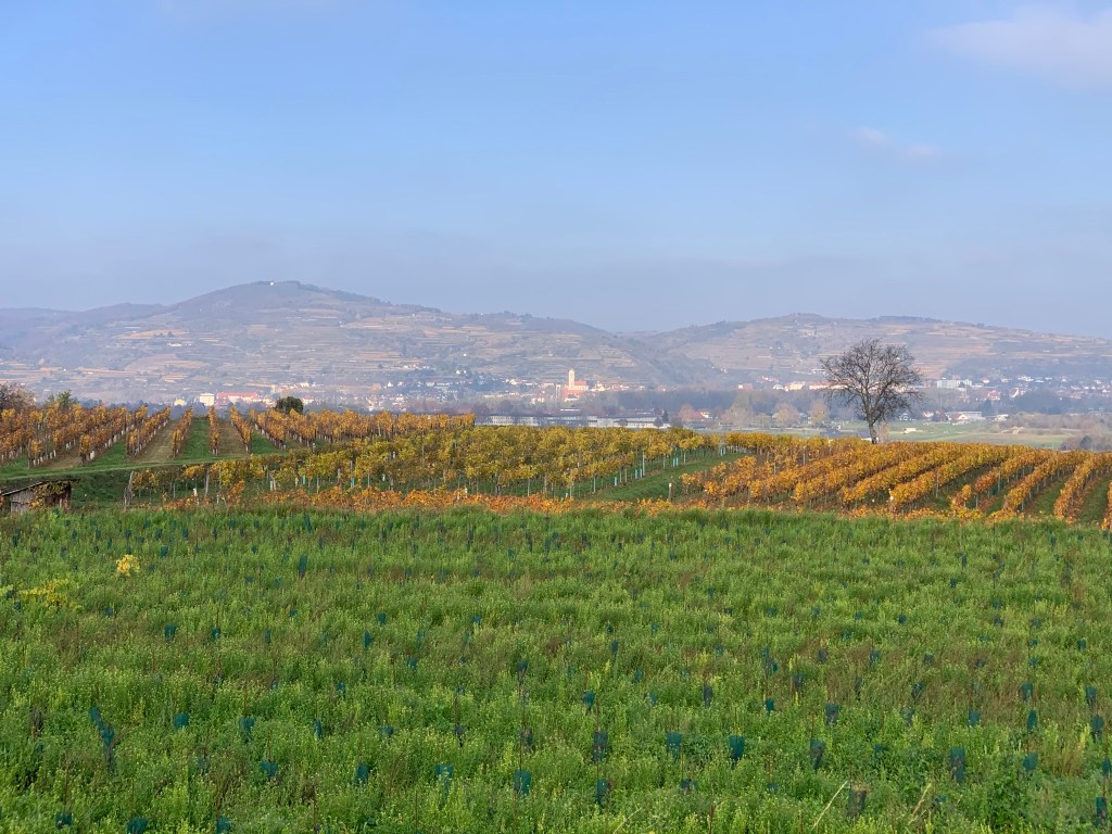 Kurz vor halb 9 starten wir wieder in Unterbergern, wo wir uns noch im lokalen Nah & Frisch mit frischen Kaffee und einer Wegzehrung versorgen. Nach Süden geht es gleich bergauf und wir erreichen schnell offene Felder und können durch den Dunst schon die Stadt Krems erspähen.