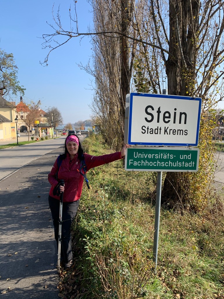 Doch noch geht es nicht retour – sondern 3km durch Stein und die Altstadt nach Krems, wo wir gegen 12:§0 nach 17,5km den Hohen Markt und damit den offiziellen Start/Ziel des Welterbesteigs erreichen. Nach einer weiteren Pause starten wir auch gleich Etappe 1 und wandern hinaus zum Kremser Kreuzberg – und wir sind mehr als überrascht wie schön dieser Weg ist.