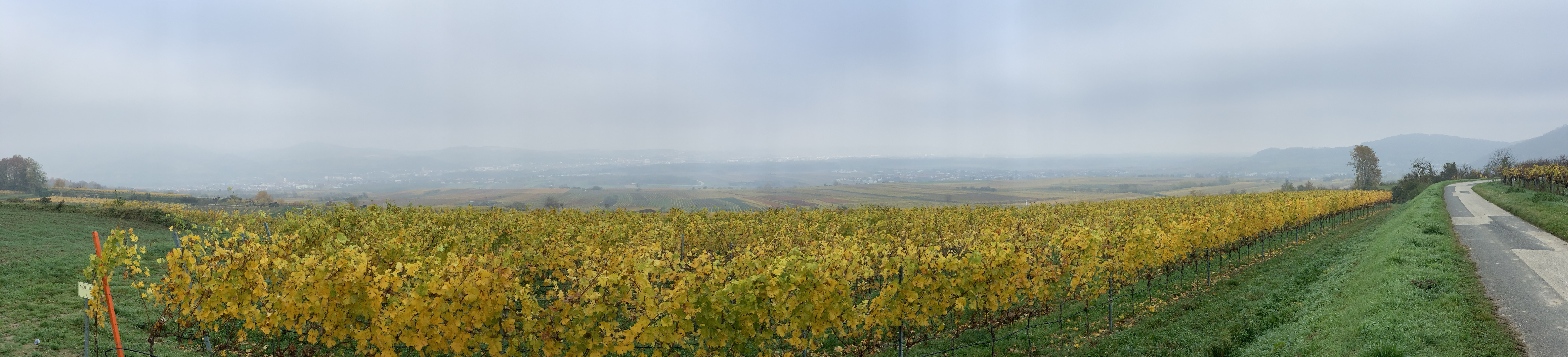Kurz vor halb 9 starten wir wieder in Unterbergern, wo wir uns noch im lokalen Nah & Frisch mit frischen Kaffee und einer Wegzehrung versorgen. Nach Süden geht es gleich bergauf und wir erreichen schnell offene Felder und können durch den Dunst schon die Stadt Krems erspähen.
