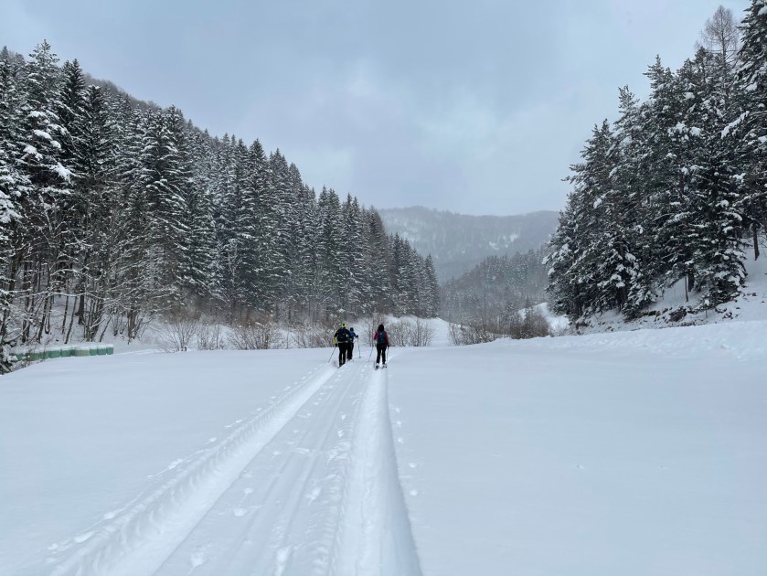 Danach wieder auf dem Weg der Aufstiegsspur bis zur Wiese beim Ortbauern, wo sich noch ein paar schöne Schwünge ausgehen. Dann fahren wir ohne Abschnallen auf bzw. neben der zugeschneiten Straße wieder aus dem Tal raus bis zum Auto.