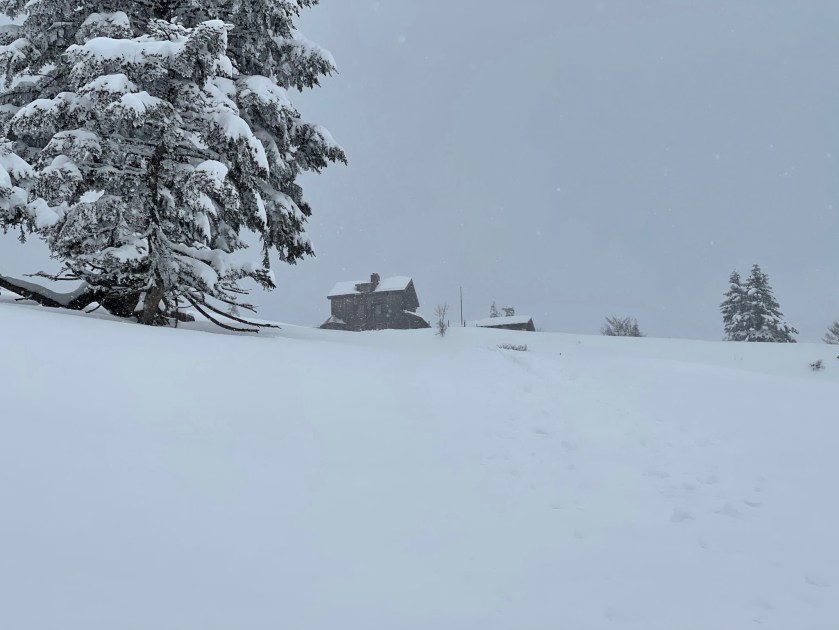 Hier biegen wir links in eine steile und relativ schmale Rinne ab. Der Wind ist inzwischen schon deutlich spürbar und so richtig gemütlich ist es nicht. Doch der viele Neuschnee macht das mehr als nur wett. Um 9:40 – also nach gut einer Stunde Gehzeit haben wir auch die Rinne geschafft und erreichen rechterhand die offene Gipfelwiese. Der Wind hält sich in Grenzen und nach knapp 30min Aufstieg quasi auf der Direttissima erreichen wir den Gipfel. Hier machen wir im offenen Winterraum eine gemütliche Pause mit frischem Glühmost, bevor wir uns an die Abfahrt machen.