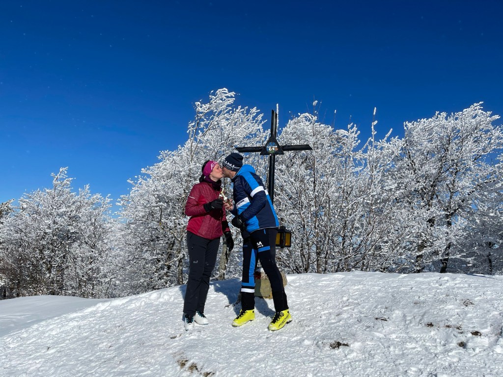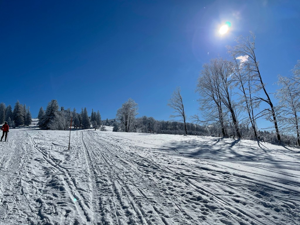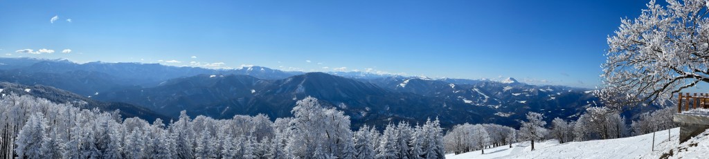 Doch nach 35 min ist es auch schon geschafft und wir erreichen einen Forstweg, der uns gemütlich zur Bergstation des Sessellifts bringt, der inzwischen auch schon den Betrieb aufgenommen hat. 1:05 h sind wir bis hierher unterwegs und ab hier kenne ich den Weg vom Winter. Doch wir wandern nicht lange die Forststraße entlang sondern biegen rechts in die Klöstertreppe ab, wo wir kurz etwas steiler hinauf zum Sendemasten am Muckenkogel wandern. Hier hat man einen schönen Ausblick uns sollte an guten Tagen viele Klöster sehen. Spannender ist aber ein steiler Abhang Richtung West – hier startete der anno dazumal der 1. Torlauf der Skirenngeschichte.