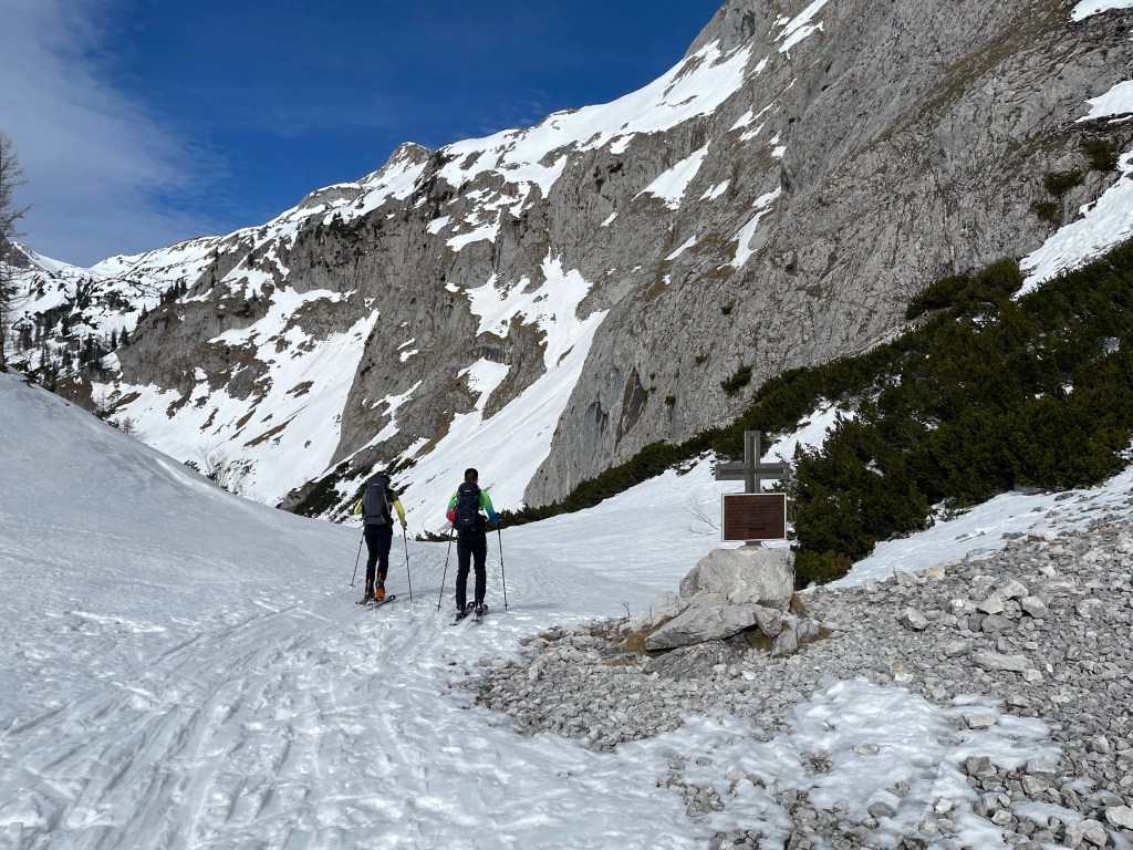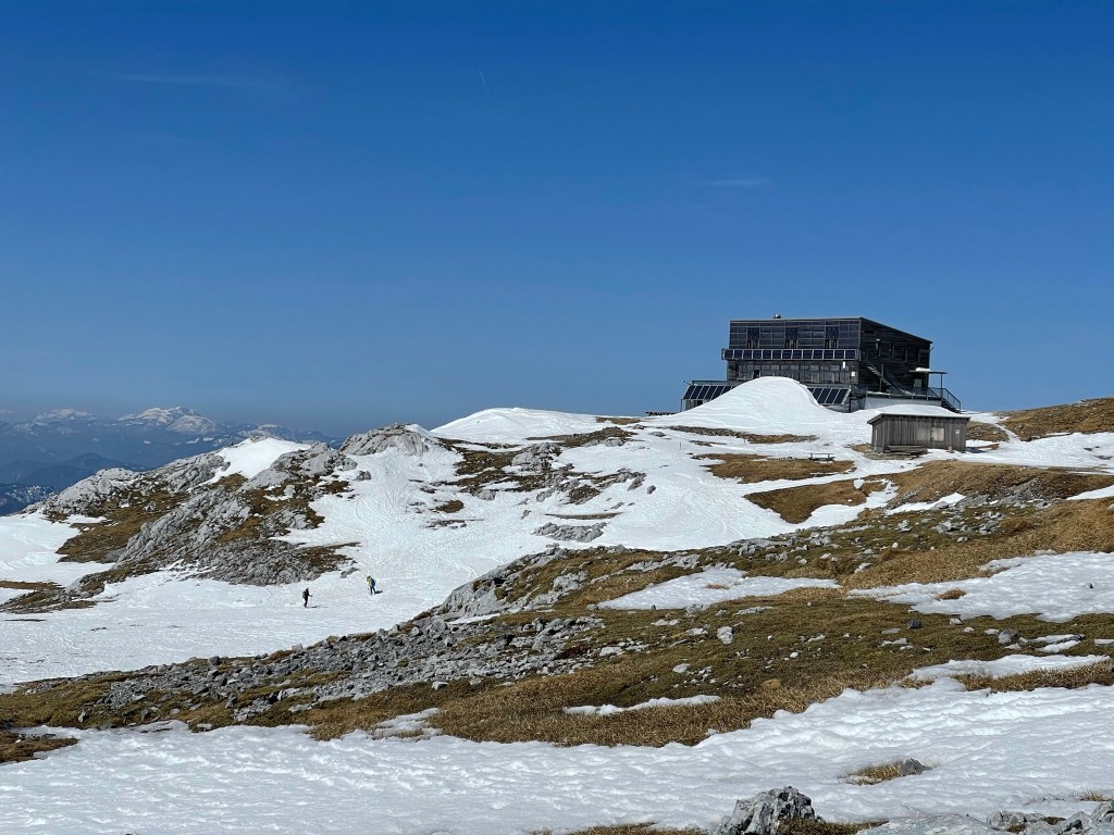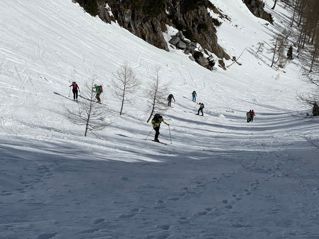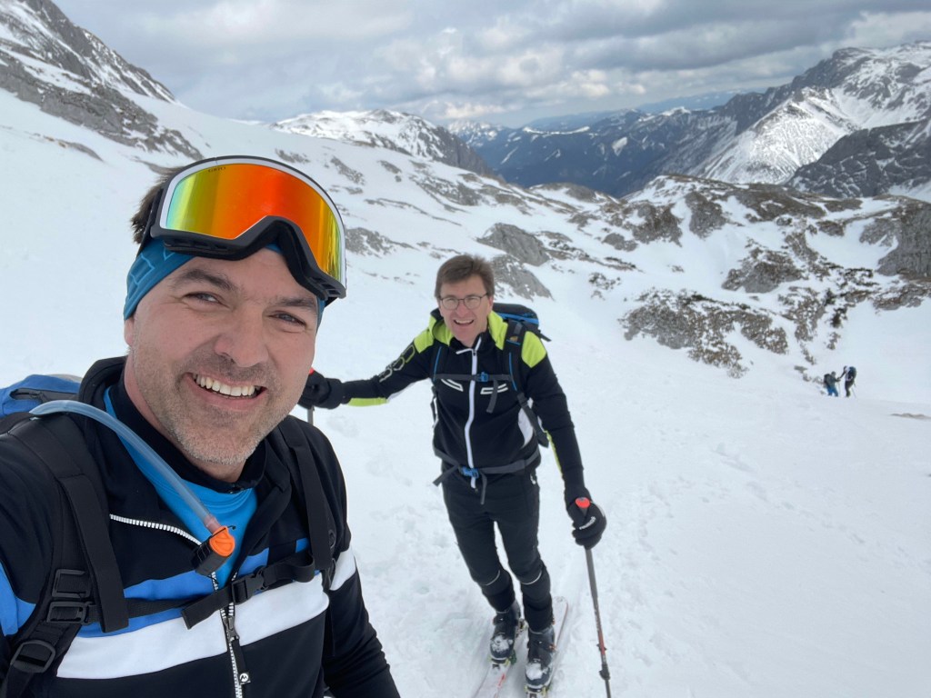 Die nun folgende Querung ist heute auch angenehm zu gehen und nach rund 4:20h erreichen wir den Umkehrpunkt des letzten Versuchs. Heute gehen wir aber weiter – das Wetter ist auch wunderschön. Den Aufschwung rauf sind wir 15min später schon beim Schiestlhaus. Hier geht es bergab – was sich als nicht ganz einfach herausstellt, weil es schon ziemlich aper ist und man die Spur sehr bedacht wählen muss. Am Gipfelhang angekommen wählen wir die direkte Linie über die Abfahrt, bis auf das erste steile Stück geht der Aufstieg super gut. Einige von uns geben aber sicherheitshalber trotzdem die Harscheisen rauf, es geht aber auch ohne.