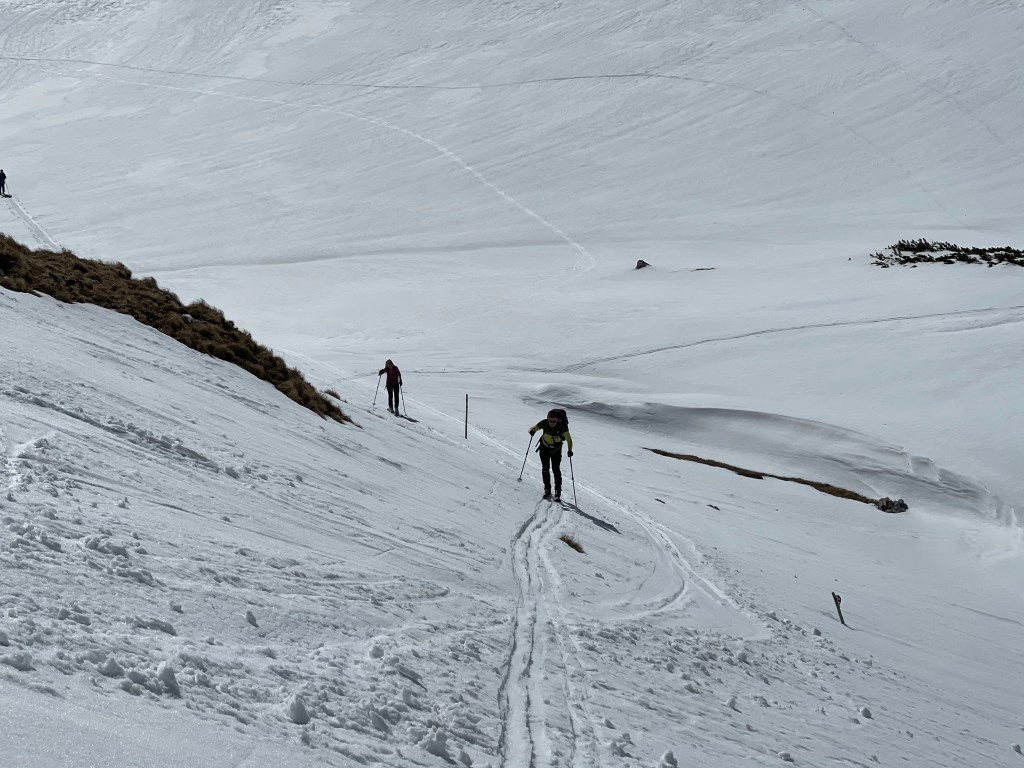 Nun gehen wir aber nicht mehr rechts rauf sondern weiter in die Obere Dullwitz bist wir am Ende des Tals den steilen Hang rechts hinauf dem Sommerweg (Graf Meran Steig) folgen. Ist wirklich knackig hier. Nach ziemlich genau 4 Stunden sind wir beim Durchgang zum Rücken des Rotgangkogels und machen eine weitere kurze Verschnaufpause. Ein kurzes Wort zu den Konditionen – es ist heute deutlich weniger eisig und wesentlich angenehmer zu gehen, wenn auch der Aufstieg aus der Dullwitz durchaus anspruchsvoll ist.