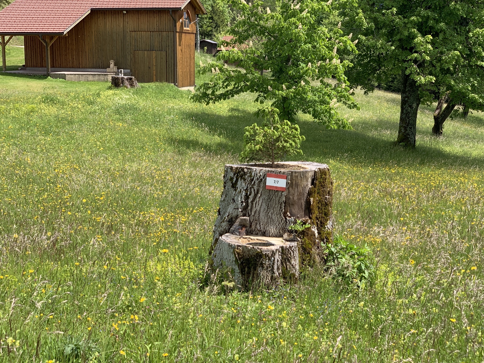 Nach einer ausgiebigen Rast starten wir um 5 nach 12 den Abstieg weiter am 06er (in der falschen Richtung halt) Richtung Norden. Hier geht es gleich ordentlich steil bergab und wir stellen fest – es wird sogar am Feiertag im Wald gearbeitet! Nach rund 40min Abstieg kommen wir auf die Lichtung Ebenwiesen, wo man kurz wieder ein kleines Stück bergauf zur Schöngrabenspitze geht (rund 80 hm).